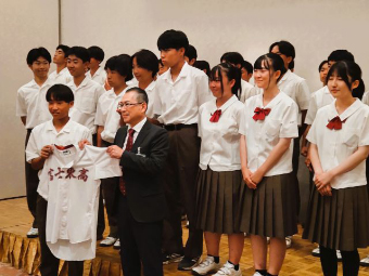 42年ぶりとなる県大会本戦出場に対し,飯山真孝会長(第2期生)より